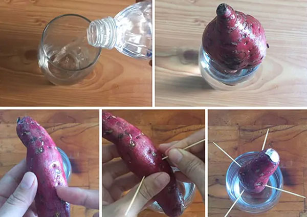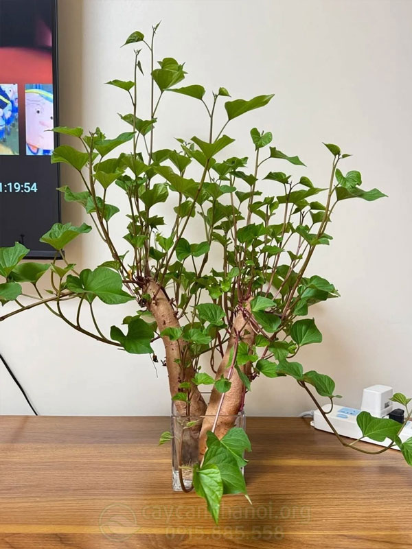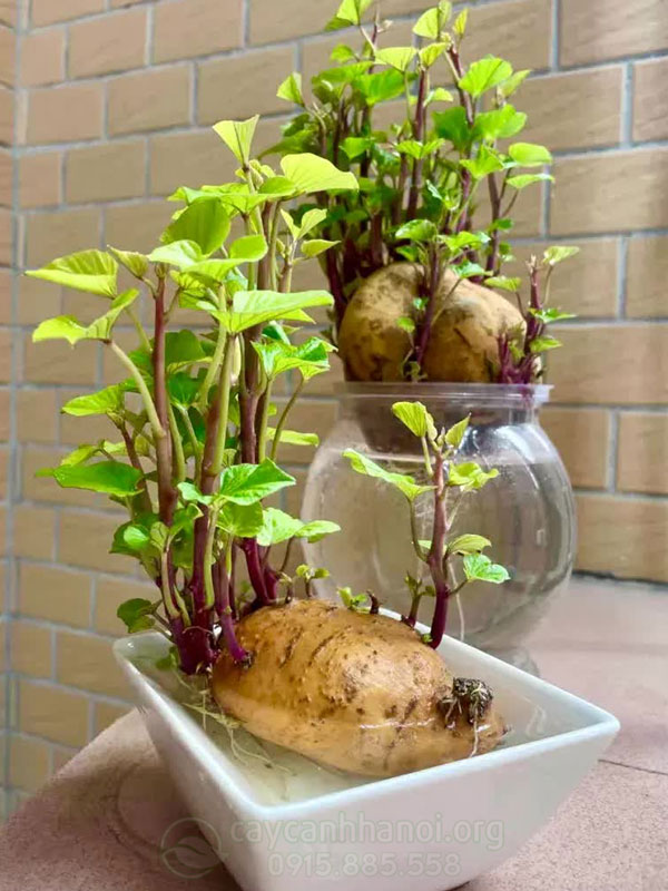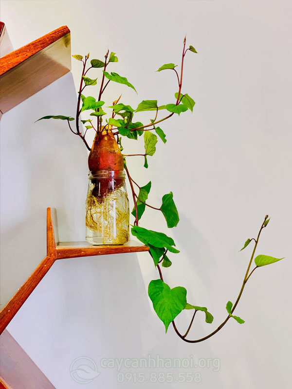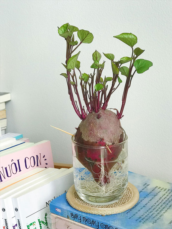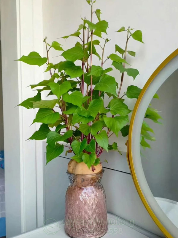 | 1. Dùng 3–4 que tăm cắm quanh thân củ khoai 2. Đặt củ treo giữa miệng bình 3. Đổ nước ngập 1/3 – 1/2 củ, không ngập hoàn toàn 4. Đặt nơi thoáng, có ánh sáng gián tiếp => Sau 5–10 ngày khoai bắt đầu ra rễ, 7–14 ngày sẽ có lá. | 1. Cắt đoạn dây khỏe, có 2–3 đốt lá 2. Ngâm phần gốc vào nước 3. Phù hợp trồng khoai lang leo, trang trí nhanh