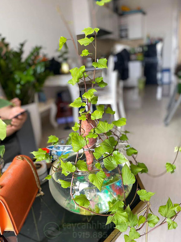 - Trang trí nhà ở – phòng khách: Cây khoai lang trồng trong lọ thủy tinh tạo điểm nhấn tự nhiên, phù hợp nhiều phong cách nội thất.